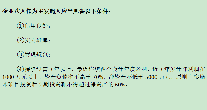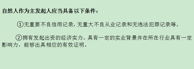 如果是自然人作为主发起人的话,那么应当满足的条件包括:信用记录没有太大问题、有经济实力、有实业背景。